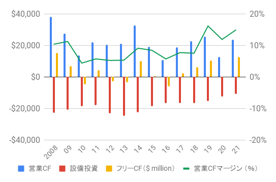 営業CFマージン(営業CF/収益)は長らく一桁台でしたが、2019年以降は10%台に乗せてきていて、同業他社とも遜色無くなってきています✨