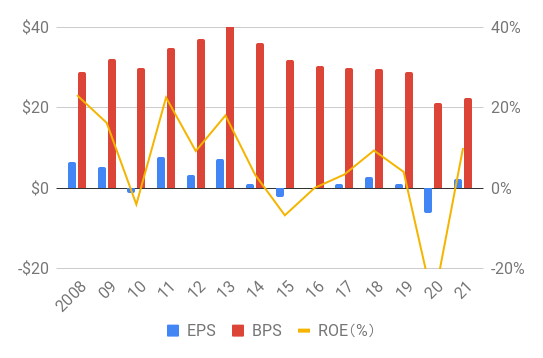 他方、現金及び現金同等物は、事故前の2009年時点では83億ドルでしたが、資産売却により、2021年時点では306.8億ドルと逆に増加しています。米連邦政府などへの和解金の支払い(年平均約11億ドル)は残っていますが、BPのキャッシュフローからすればそれほど大きな額ではなく、あまり倒産リスクを気にかける必要はないでしょう。