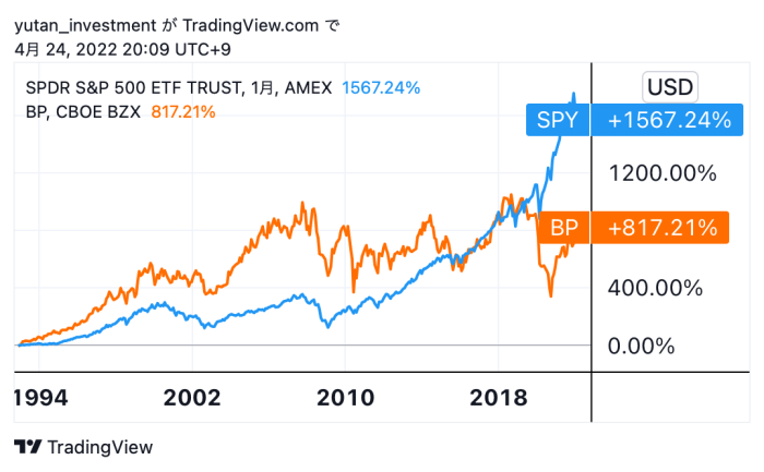 もう本当に買い付けるタイミングとしては最悪で、2022年4月現在もなお、配当込みでも損失を出している数少ない銘柄です。率直に言って、BPへの投資は失敗だったと言わざるを得ないです。