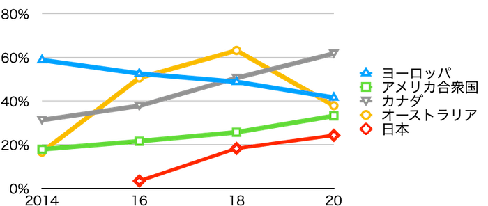 定義変更のあったヨーロッパとオーストラリアは別として、最大の株式市場であるアメリカ合衆国、カナダ、日本の割合はいずれも上昇しています✨
