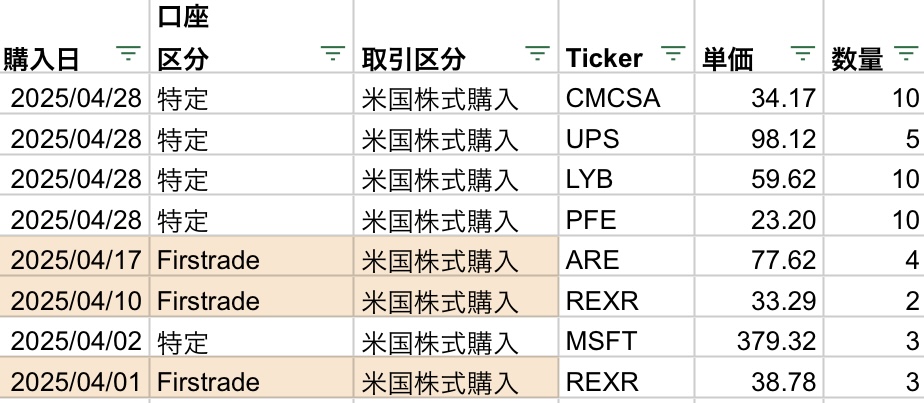 素材・化学メーカーであるLYB(ライオンデルバセル)はトランプ関税の影響を大きく受ける銘柄ということもあり、下落しています。景気循環(シクリカル)銘柄でもあるため、下落幅の大きさは想定の範囲内ですが、金融セクターと同様、長期で保有する株ではないですね。将来的に株価が上昇したタイミングでは売ることを見越して、少しずつポジションを増やしていきたいです。
